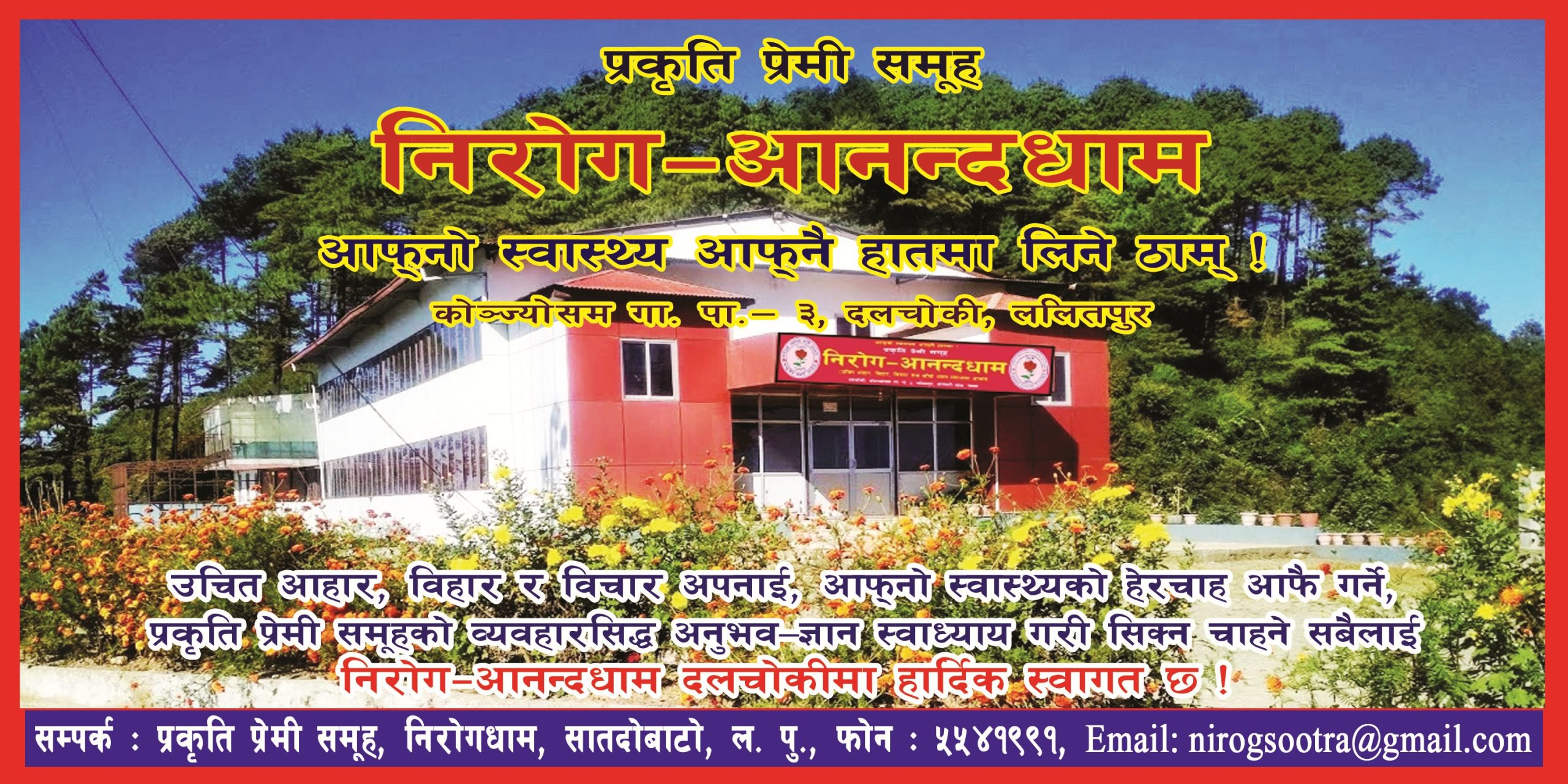 - प्रकृति प्रेमी समूह, निरोगधाम, निरोग-आनन्दधाममा साँचो ध्यान (Real Meditation) सिक्ने व्यवस्था छ।