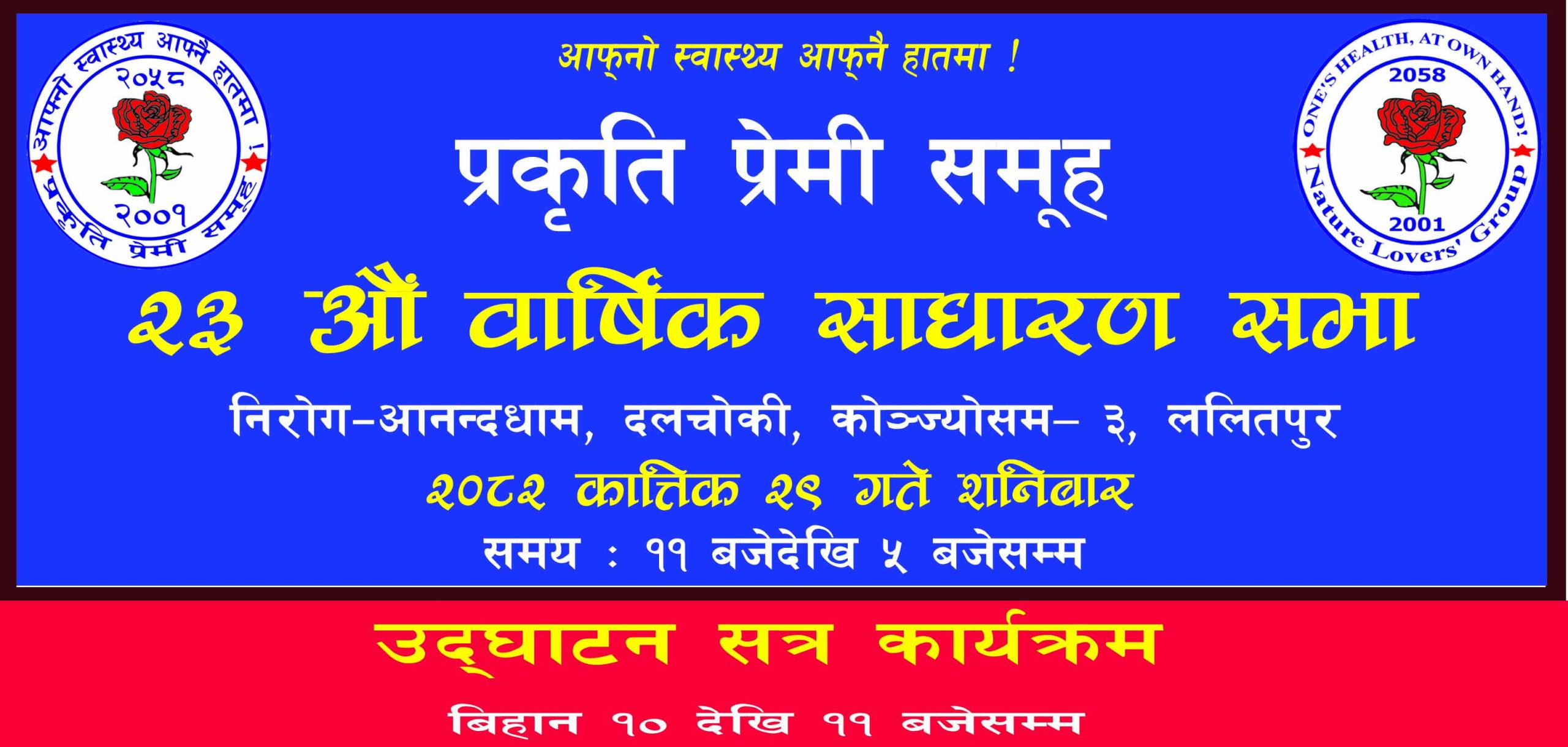१) २०८२ कात्तिक २९ गते प्रकृति प्रेमी समूहकाे २३ साैं साधारण सभामा आ. व. २०८१/०८२ मा संस्थाबाट भए गरेका कामकाे समीक्षा तथा आ. व. २०८२/०८३ मा गर्ने काम विचार विमर्श गरी नयाँ उत्साह र जाेशकासाथ नयाँ याेजना बनाउने काम हुने हुँदा सम्पूर्ण आजीवन सदस्य मित्रहरुले साे दिन पूरै समय साधारण सभामा सक्रिय सहभागी हुन समय मिलाउनु हुन अनुराेध छ ।
