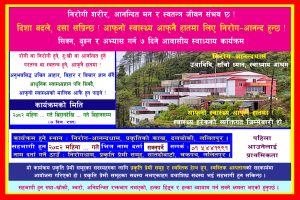 निरोग-आनन्द र स्वास्थ्य अरुलाई जिम्मा दिएर हुँदैन ! औषधिको भर परेर मात्र पनि हुँदैन ! यसको लागि आफ्नो स्वास्थ्यको जिम्मा आफै लिनुपर्छ, उचित आहार, विहार र विचार आफै गर्नुपर्छ ! आफ्नो मालिक आफै हुनुपर्छ ! आफ्नो स्वास्थ्य आफ्नै हातमा लिने, आफ्नो मालिक आफै हुने, उचित आहार, विहार र विचार आफैले गर्ने विधि सिक्न, “७ दिने शिविर दिशा बदले दसा सप्रिन्छ” कार्यक्रम हो ! मौका आउँछ पर्खंदैन, बगेको खोला फर्कंदैन ! कार्यक्रम हुने बेलामा बेलैमा नाम दर्ता गरौँ !